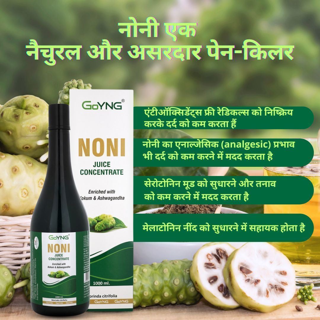 एंटी-इंफ्लेमेटरी गुण : नोनी में एंटी-इंफ्लेमेटरी (anti-inflammatory) गुण होते हैं जो शरीर में सूजन और दर्द को कम करने में मदद करते हैं। सूजन कई प्रकार के दर्द का प्रमुख कारण होती है, जैसे कि गठिया, मांसपेशियों में दर्द, और जोड़ों का दर्द। नोनी में मौजूद सक्रिय यौगिक, जैसे कि स्कोपोलेटिन (scopoletin) और डैम्नाकैंथल (damnacanthal), सूजन को कम करने और दर्द को राहत देने में सहायक होते हैं।