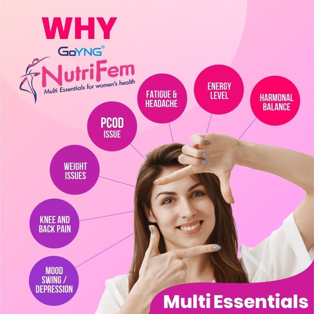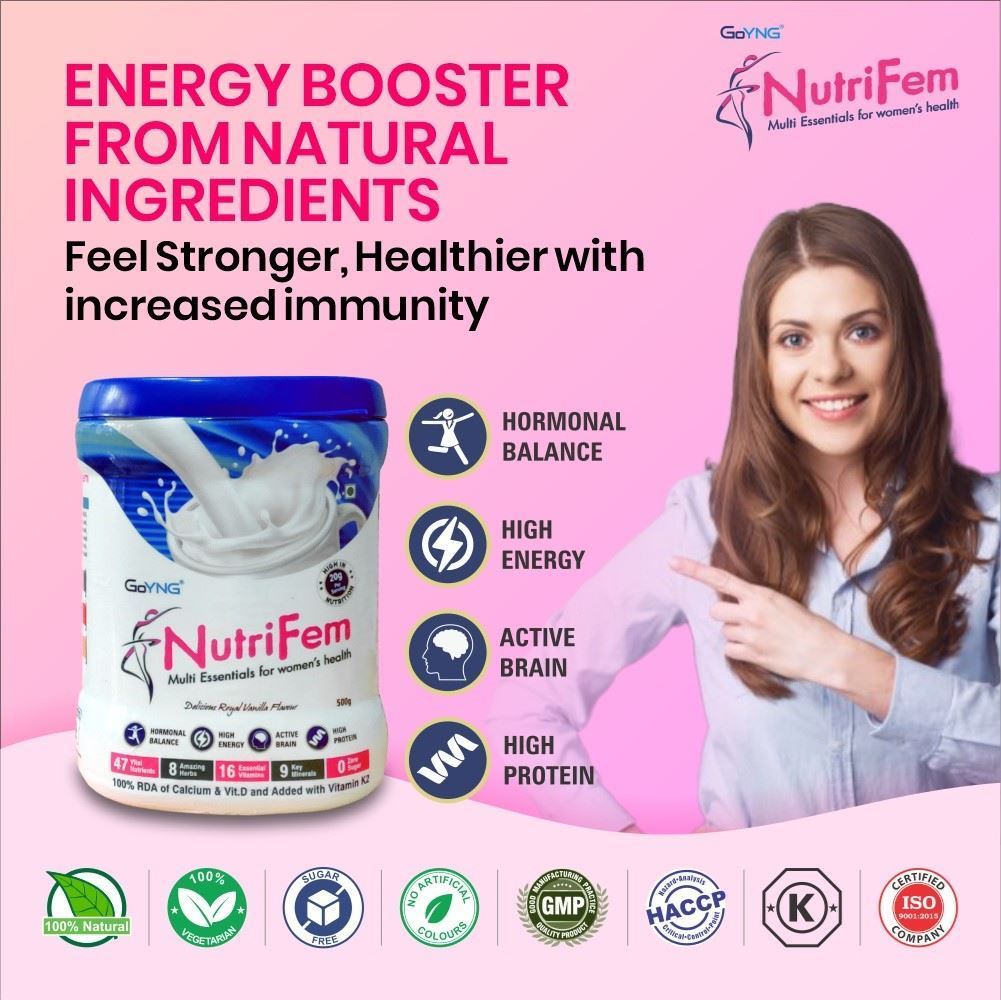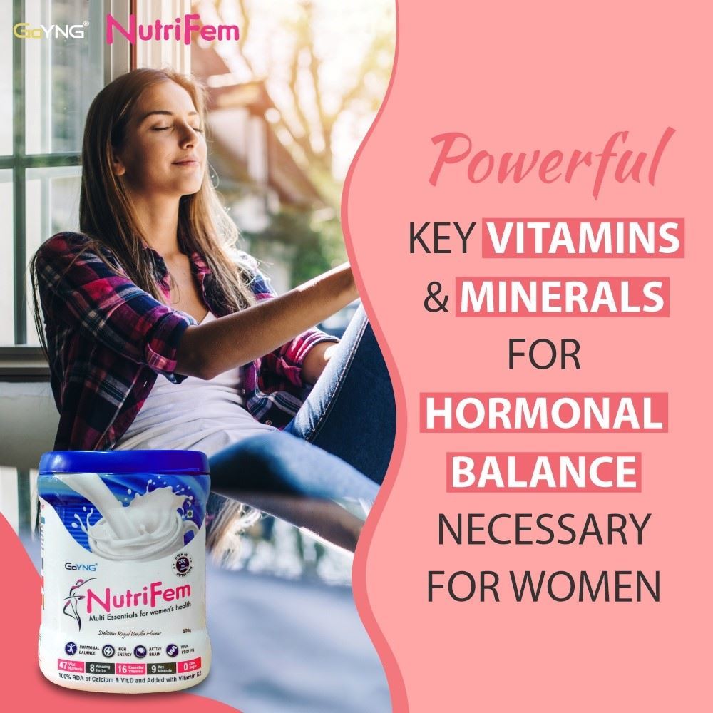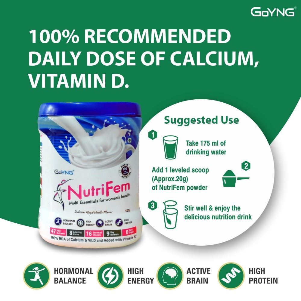 For women with hectic lifestyles and in need of healthy nutrition, GoYNG brings Multi-essentials NutriFem powder at a therapeutic dosage. It is a powerhouse of essential vitamins and key minerals- supporting hormone balance and boosting immunity.