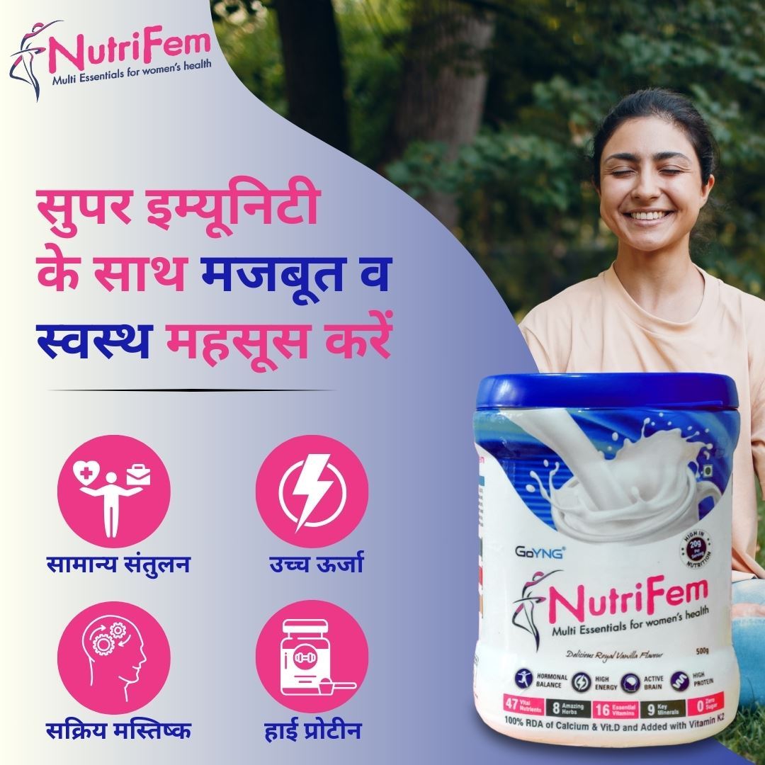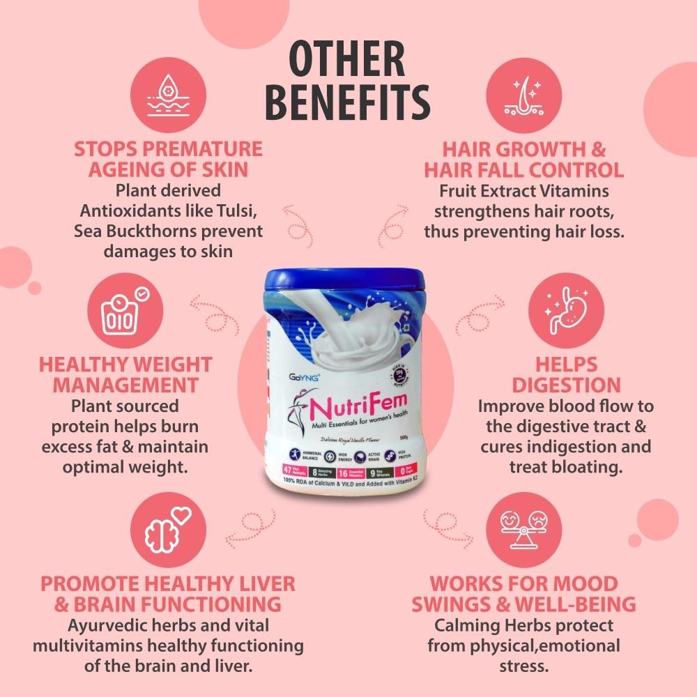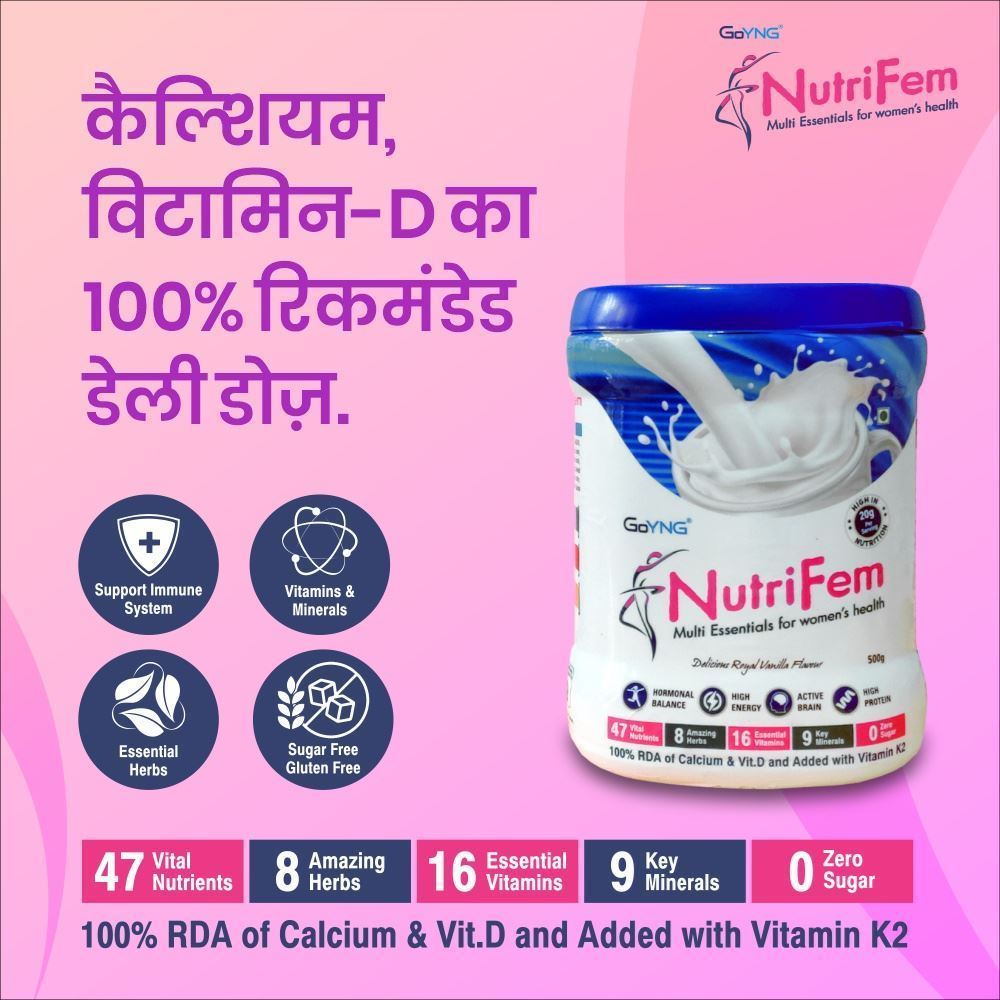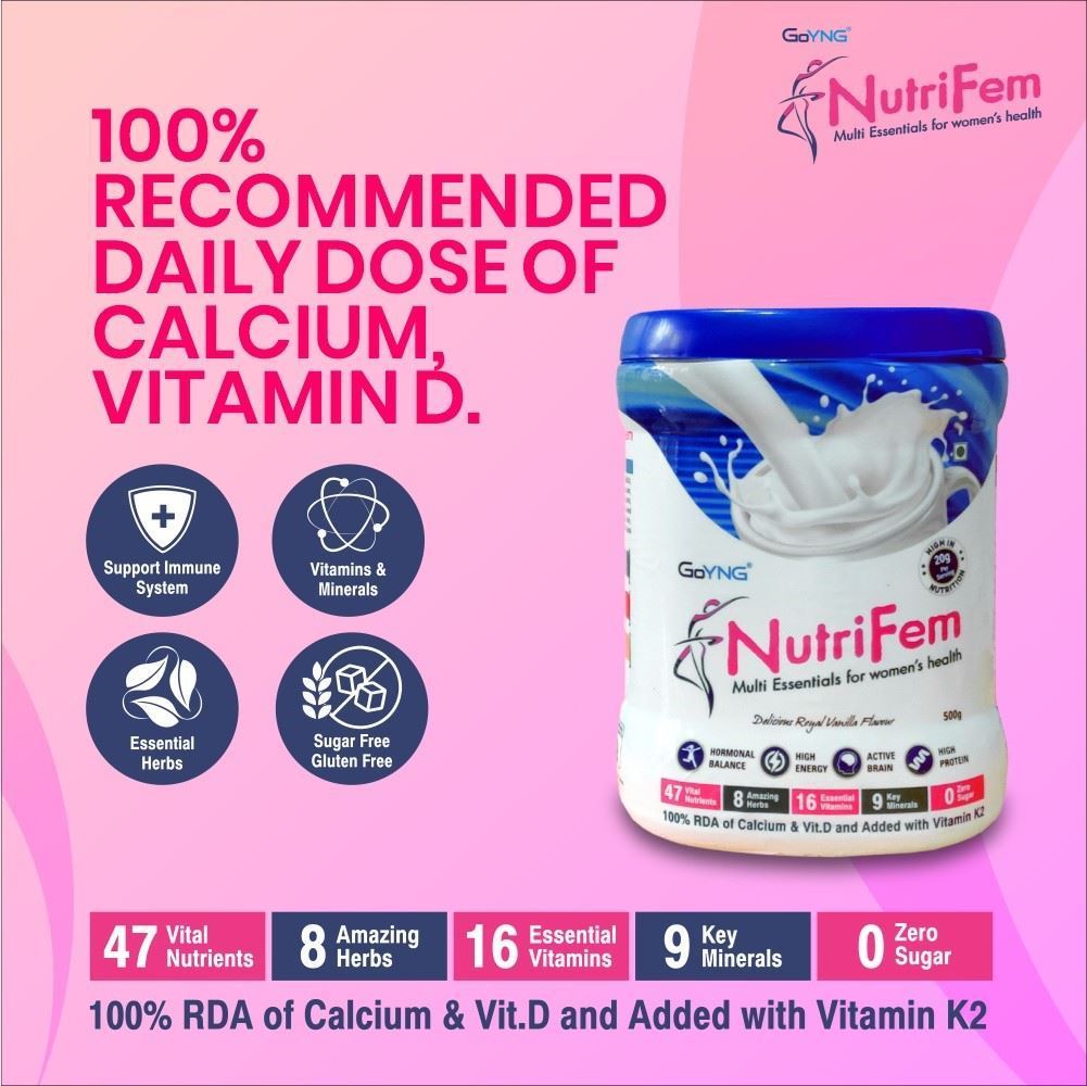 For women with hectic lifestyles and in need of healthy nutrition, GoYNG brings Multi-essentials NutriFem powder at a therapeutic dosage. It is a powerhouse of essential vitamins and key minerals- supporting hormone balance and boosting immunity.