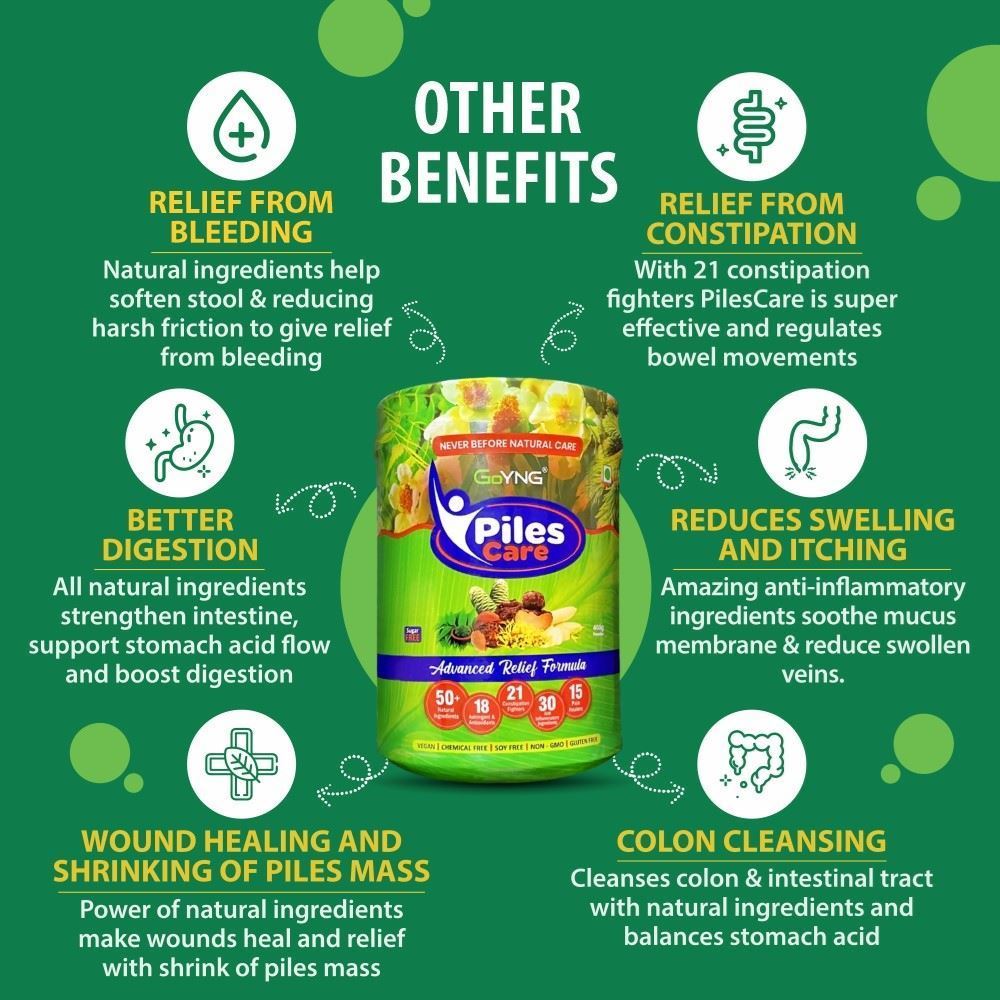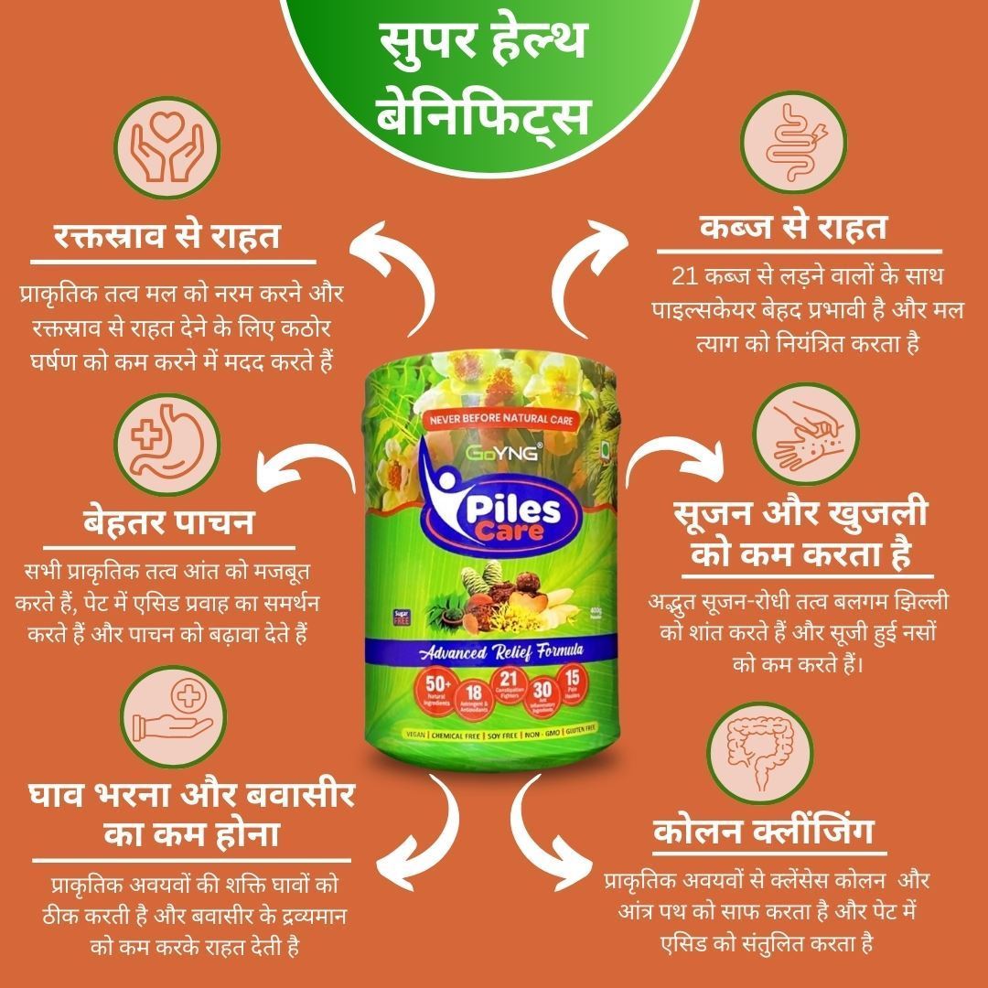 QUALITY STANDARD: Goyng Piles Care is certified by GMP, ISO, and FSSAI, ensuring its safety and effectiveness. It is chemical-free, non-GMO, and not chemically processed.