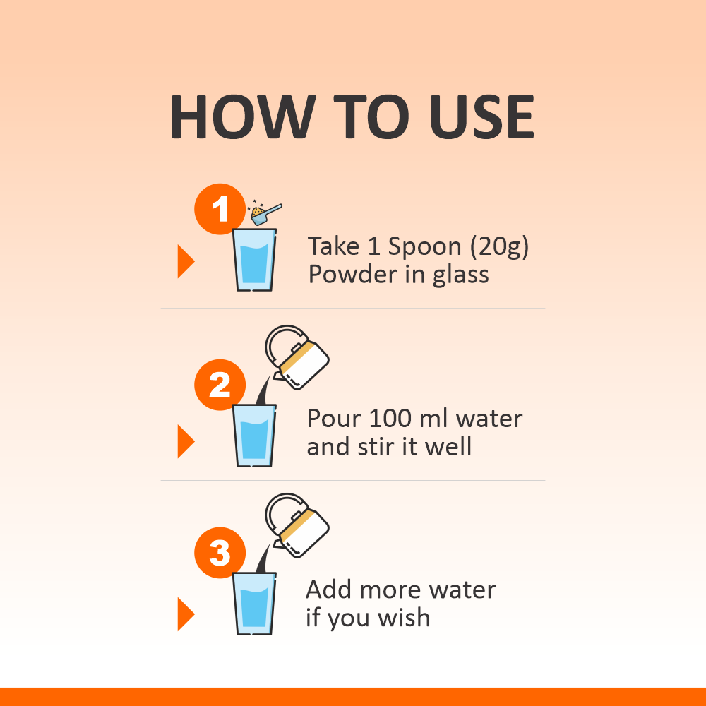 RECOMMENDED DOSAGE: Simply mix 1 scoop (20g) of powder with half a glass of water for easy and convenient use.